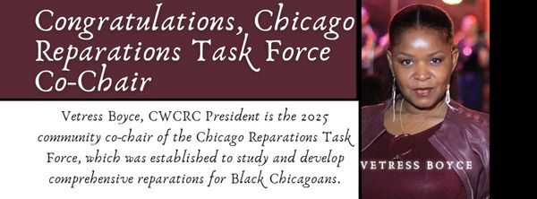 Vetress Boyce, President of CWCRC is the Co-Chair for the City of Chicago Reparations Task Force. She Co-chair's the group with Alderman Desmon Yancy, 5th ward. Together with the 40 chosen individuals they will produce recommendations for reparatory Justice - Repair.